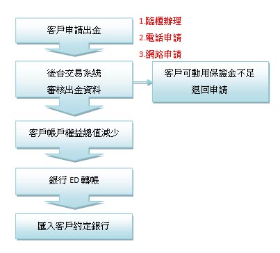 1.國內外出金:臨櫃辦理、電話申請出金、網路申請出金