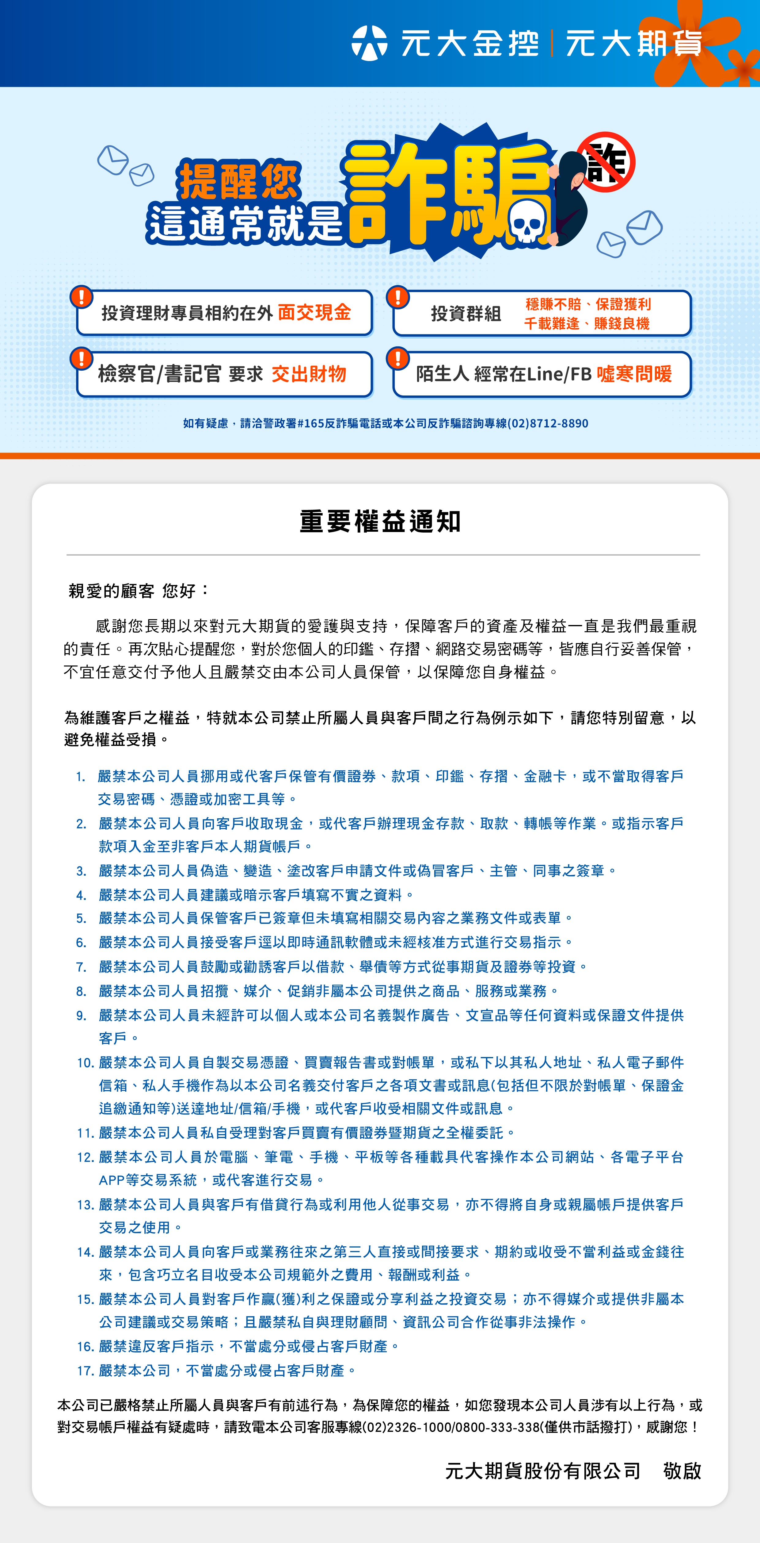 元大期貨十分重視公平待客原則之理念,由董事會及總經理親自領導推動,將「金融服務業公平待客原則」所定之10項原則及董事會之推動等,落實保護金融消費者權益,確保本公司提供之優質的商品或温暖的服務,不論是設計、廣告、銷售、服務諮詢或客訴處理,皆秉持公平待客的精神,並遵守期貨交易法及金融消費者保護法等相關法令規定。
