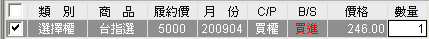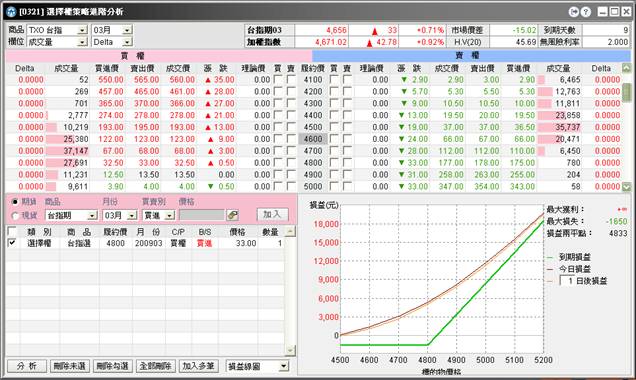 操作說明: (1)商品欄位的下拉箭頭可瀏覽選擇權商品名稱,右方選擇商品月份,欄位處下拉選擇成交量、理論 差、隱含波動率、時間價值或未平倉量,右方可選擇Delta、Gamma、Vega、Theta或Rho。 (2)接著可於買權或賣權處,對欲分析的履約價勾選買或賣,畫面左下區塊即顯示所勾選的商品資訊, 選擇完後,按下分析鈕,右下方區塊即顯示使用者所勾選商品的分析圖。 (3)相關商品價格帶入系統預設價位,商品數量帶入1 ,亦可提供使用者自行輸入。 (3)該分析圖預設為損益線圖,另可下拉選擇損益明細表,或風險表。該分析圖右方亦可輸入欲分析 幾日後的損益,輸入後按下Enter鍵即可。(4)刪除未選鈕,可將加入分析的商品但方框內尚未勾選者刪除;刪除勾選鈕可將已加入至畫面左下 角且前方有勾選的商品刪除;全部刪除鈕可將已加入至畫面左下角的商品全數刪除。