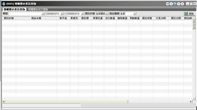 (1)本功能顯示期權歷史委託回報。可下拉選擇帳號、日期區間、委託狀態、商品種類,按