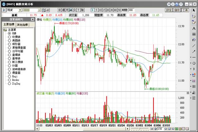 (10)選單編輯列-主要指標頁:原預設為K線,可依投資人需求,選擇其它指標。