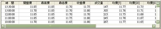 檔)、 游標資料(當滑鼠移過走勢圖,則顯示該點的日期、價格、均價、均量)、資料表