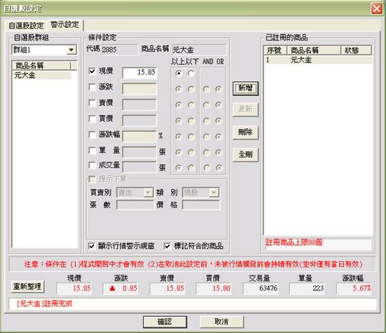 (1)按下自選股行情之警示紐,顯示警示設定視窗,如上圖。