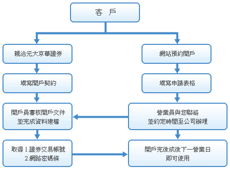 回答:您需本人攜帶身分證(正本)及開戶印章至原開戶分公司填寫【電子下單帳戶委託買賣同意書(含有風險預告書)】,隔日後即可使用。