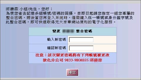新領密碼如何變更:至元大證券首頁輸入新領之原始密碼進行登入,登後會顯示變更新密碼及確認新密碼的視窗,請輸入您欲更改的密碼,再按確定即完成密碼變更。 |