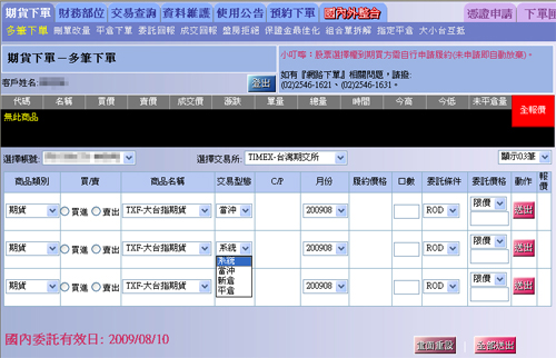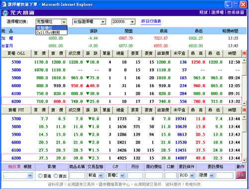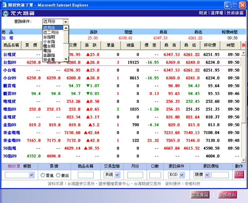 商品報價的類別為【即時行情】、【期貨價差行情】、【期貨近月轉倉行情】、【選擇權行情】或【摩台】。 |