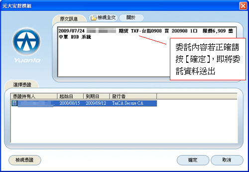 委託送出,會顯示憑證的委託確認視窗,委託內容若正確請按【確定】鍵,委託單立即送出。 |