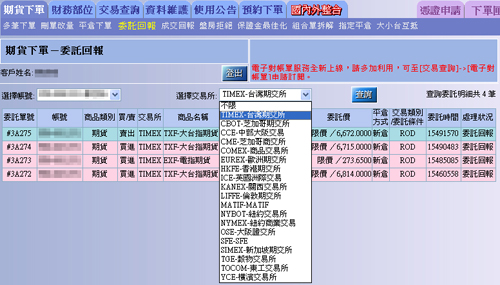 ◎ 國內外共八個交易所(台灣期交所、CBOT、CME、HKFE、LIFFE、SIMEX、TOCOM、OSE)。 |